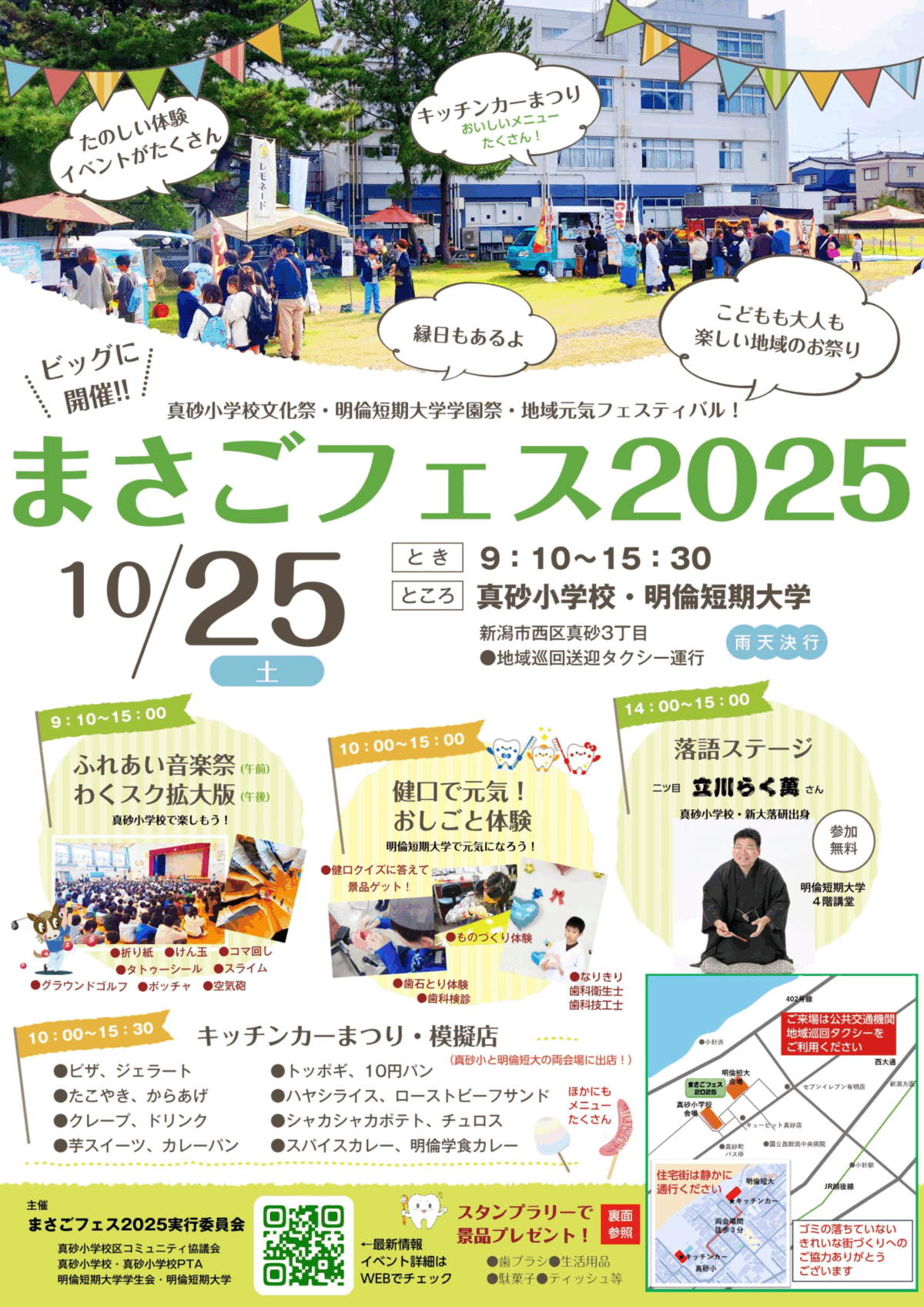 明倫短期大学「明倫祭」と近隣の真砂小学校「文化祭」と共同で『まさごフェス』を開催します🎉 真砂地区にある小学校と大学がタッグを組んで「音楽、飲食、歯科職業体験」などなどイベント盛りだくさんのフェスになります!