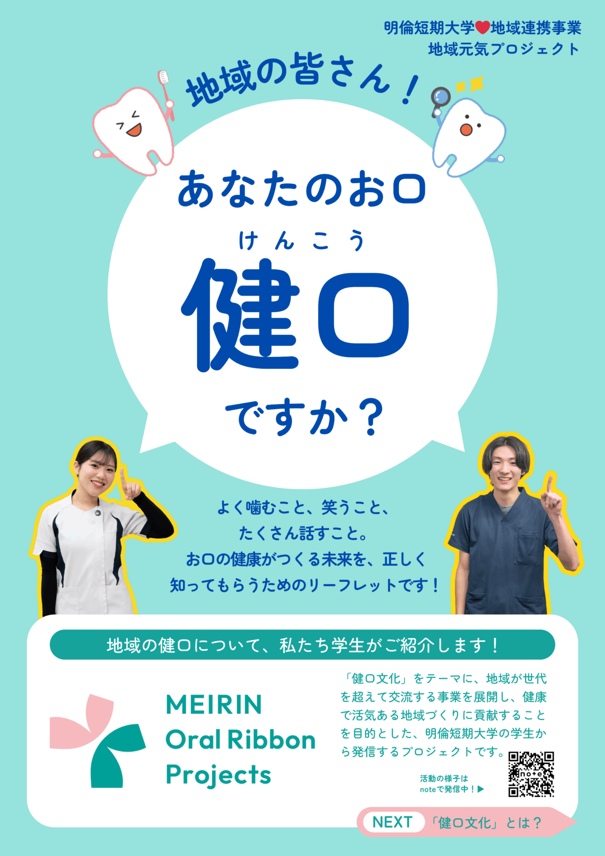 私たちは、明倫短期大学で地域課題に取り組む「Meirin Oral Ribbon Projects」を立ち上げた学生チームです。この度、2025年7月から制作に取り組んできた健口文化(けんこうぶんか)の啓発リーフレットが完成いたしましたのでご報告いたします。