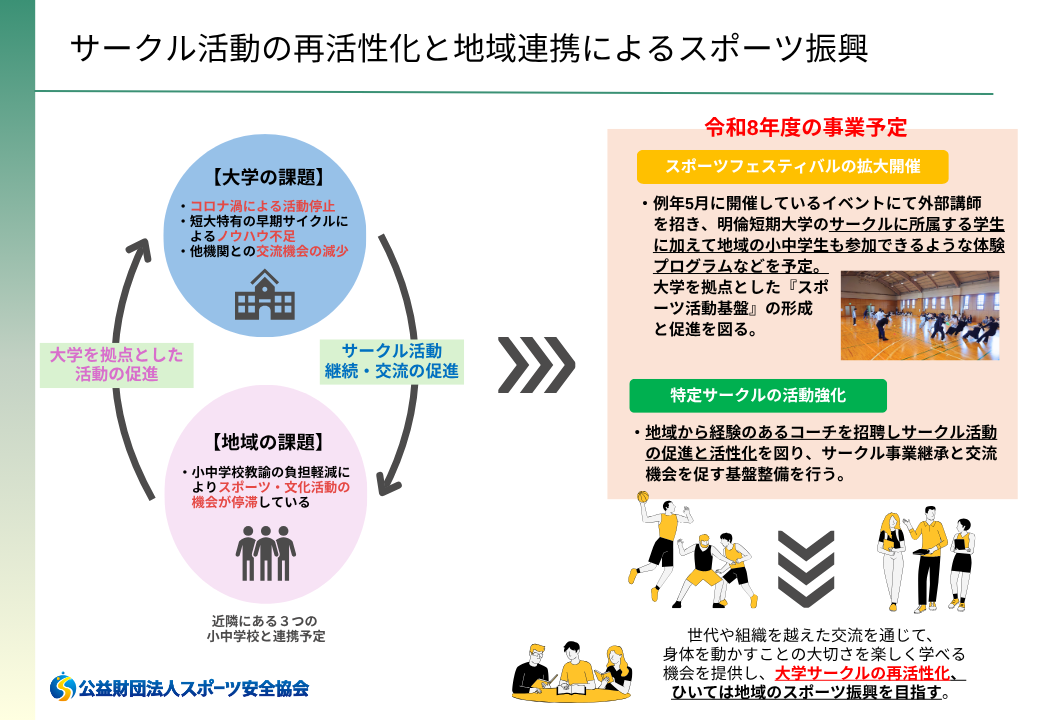 このたび、公益財団法人スポーツ安全協会「令和8年度スポーツ活動等普及奨励助成事業(大学サークル活動等支援事業)」において、明倫短期大学が提案した「サークル活動の再活性化と地域連携によるスポーツ振興」が採択されました。
