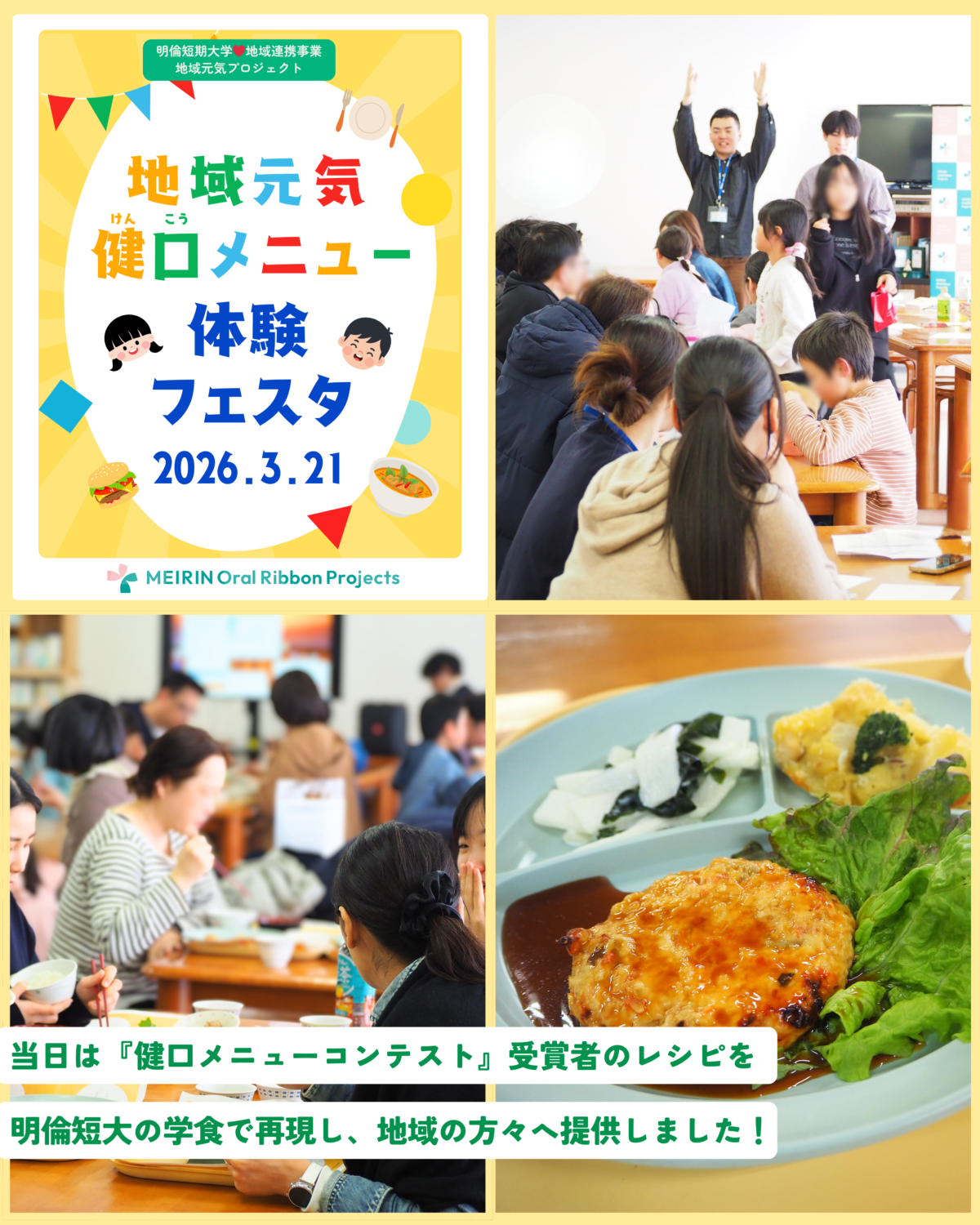 2026年3月21日(土)にMeirin Oral Ribbon Projects「地域元気健口メニューコンテスト」にて入賞したメニューを明倫短期大学の学食で再現したイベント『健口メニュー体験フェスタ』を開催しました!