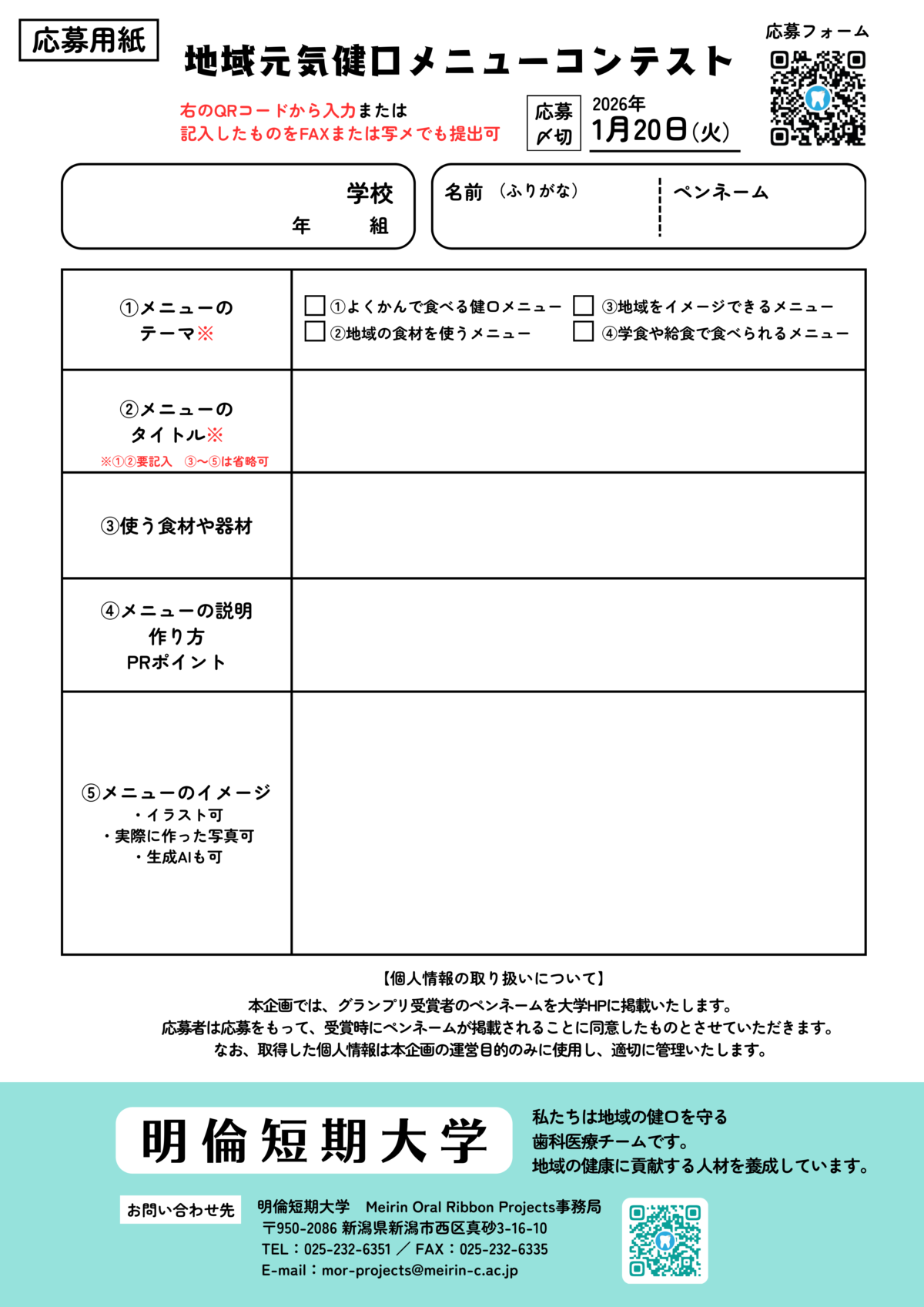 「金賞🏅」に選ばれたメニューは、明倫短期大学の学食で再現し、地域の方々を招いてメニューを提供する予定にしています。たくさんのご応募をお待ちしています‼️