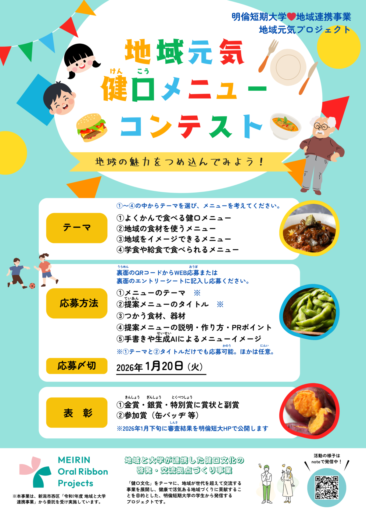 子どもから大人まで、世代を問わず参加可能です!「地域の食材を使ったメニュー🍠」、「学食や給食で食べられそうなメニュー🍽️」など、自由な発想でご応募いただけます。